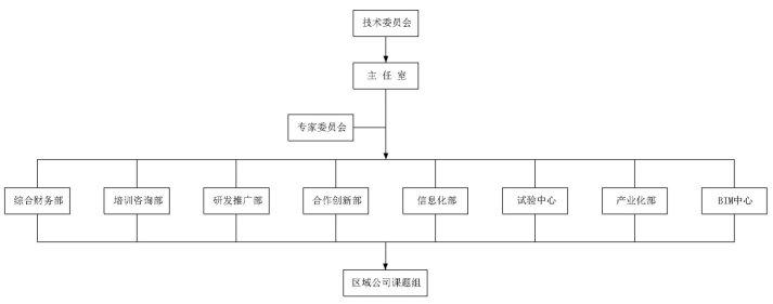 管理層:技術中心在主任室領導下,設綜合財務部、研發咨詢部、合作創新部、產業化部、培訓推廣部、信息化部、BIM中心、試驗中心。
